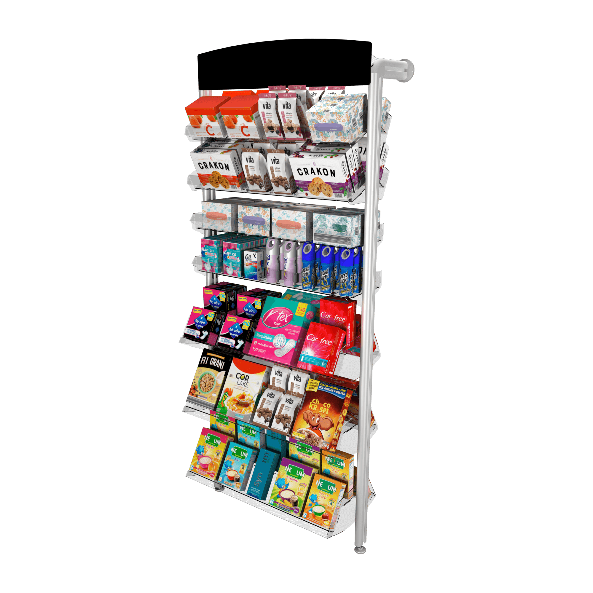 Ideal para exhibiciones de alto impacto, este módulo cuenta con 7 entrepaños ajustables y una estructura en aluminio anodizado de alta resistencia. Con capacidad de 0.57 m³, tiene dimensiones de hasta 80 cm de ancho, 200 cm de alto y 39 cm de profundidad, optimizando la visibilidad de productos en farmacias con gran afluencia​.